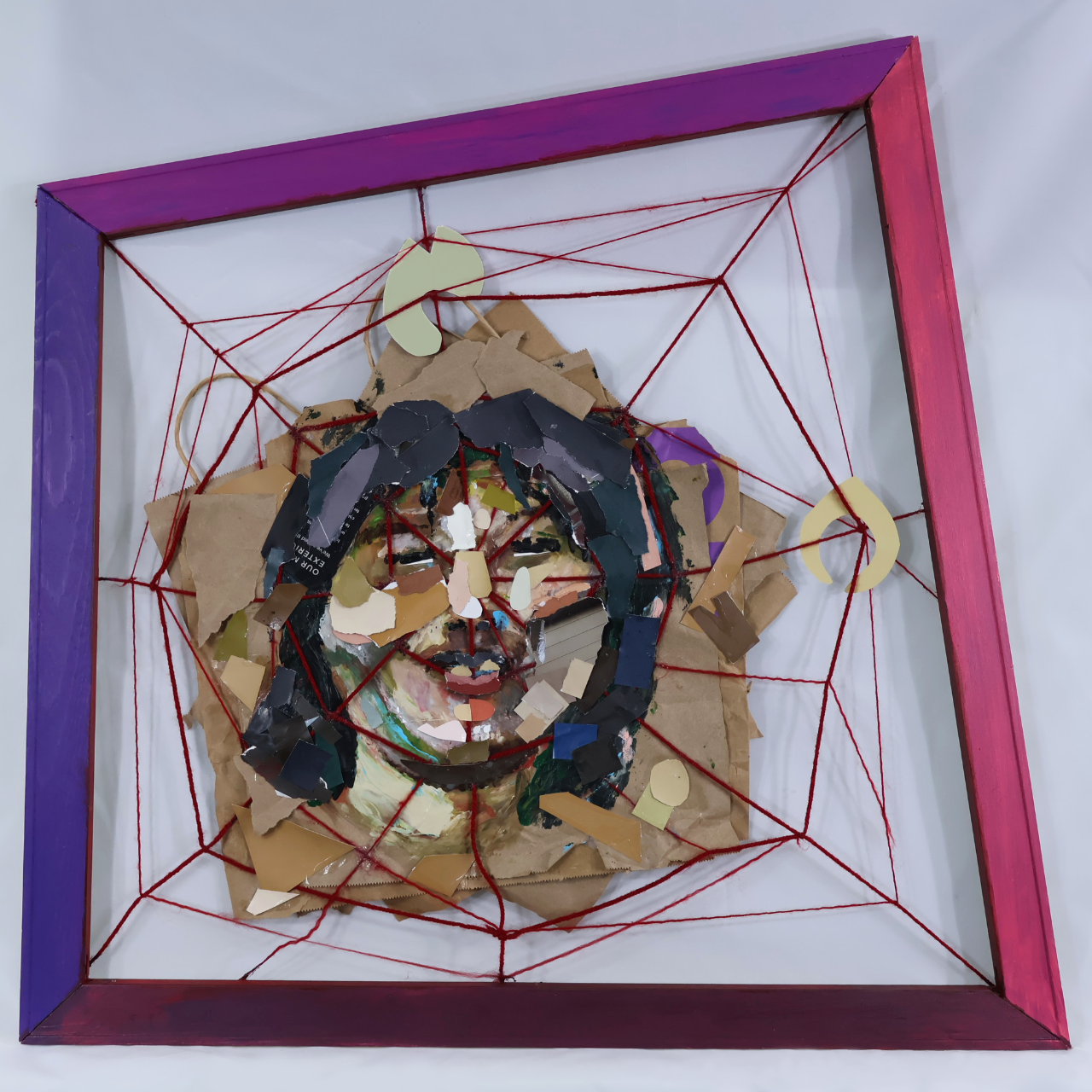 Acrylic on paper collage with yarn 23" x 24" x 28" x 28"