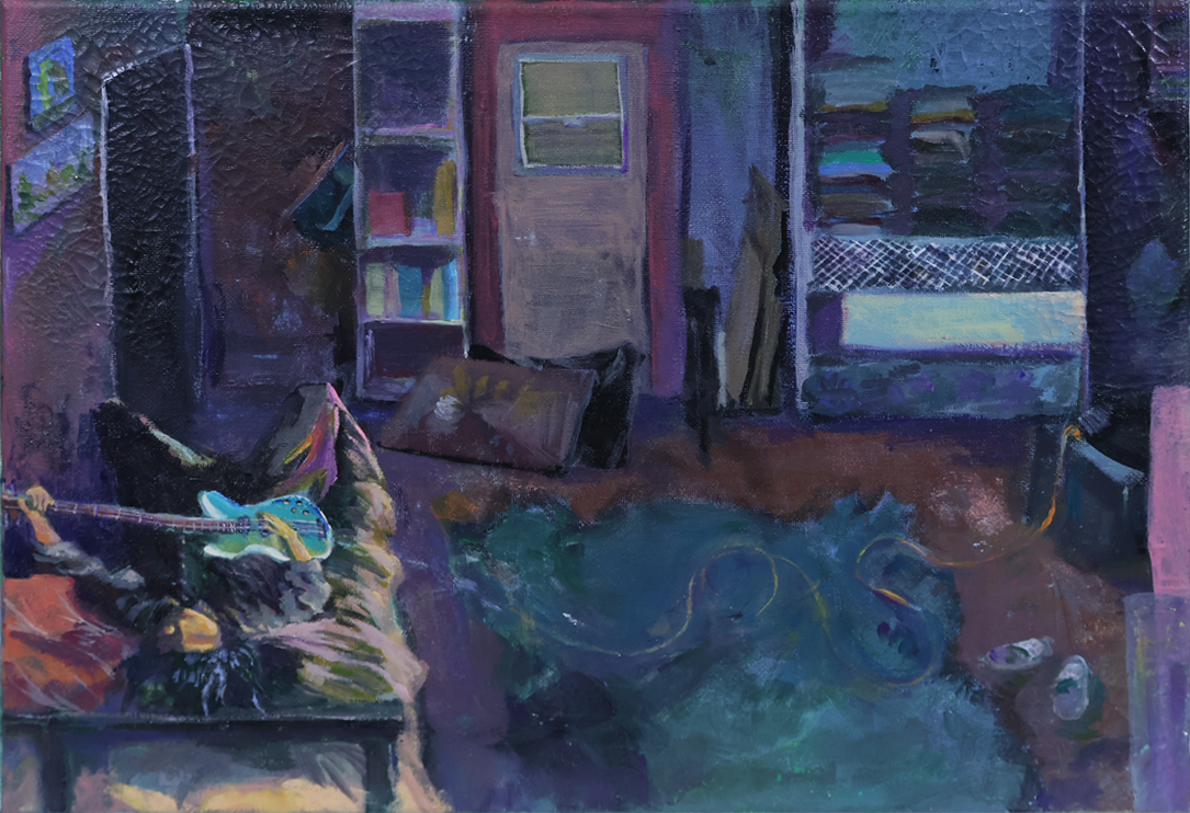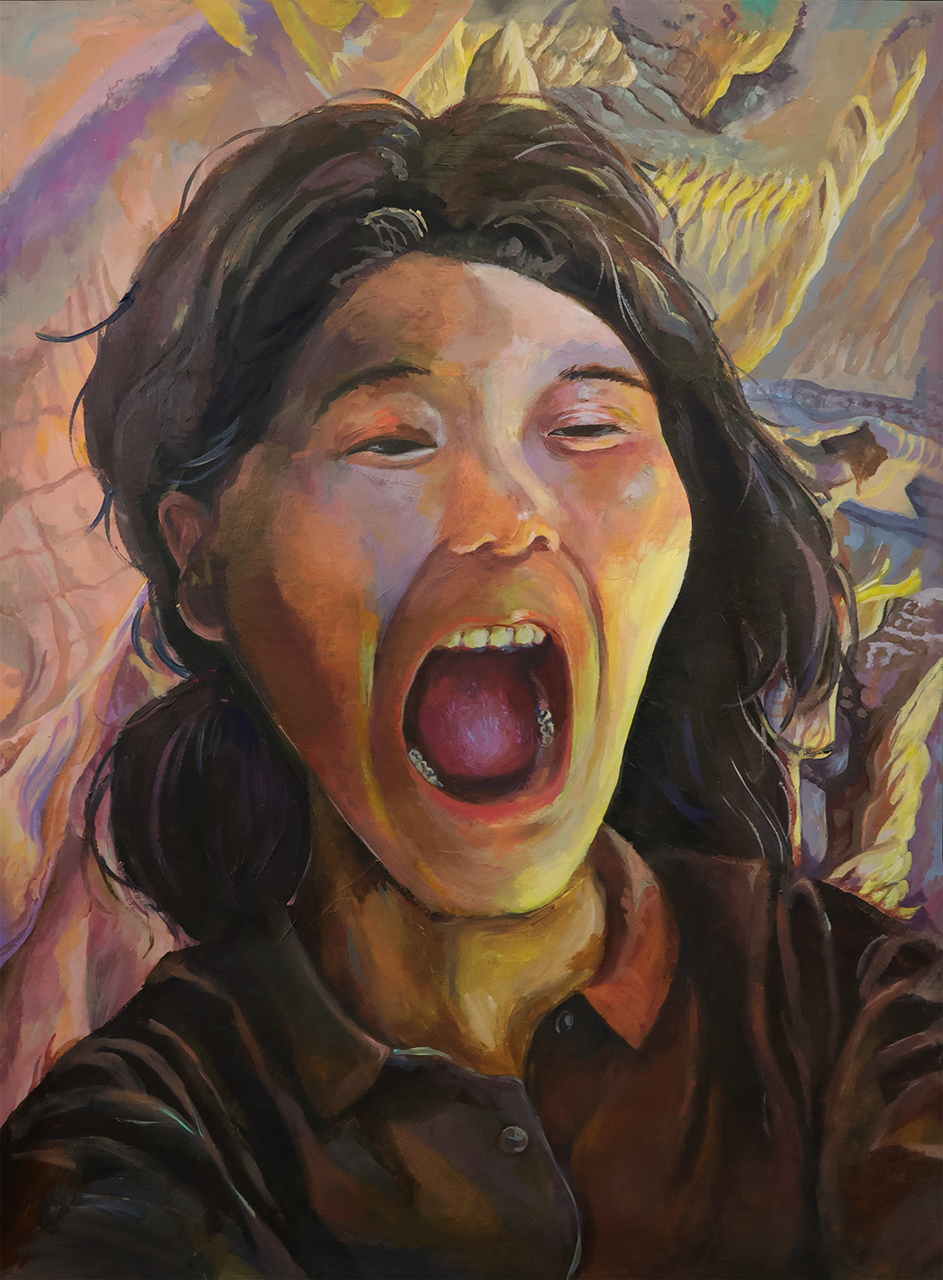 For this self-portrait, I tied up a small mirror to a string that hung down from my wall, and did the entire painting while laying on my bed and looking up at the mirror.
