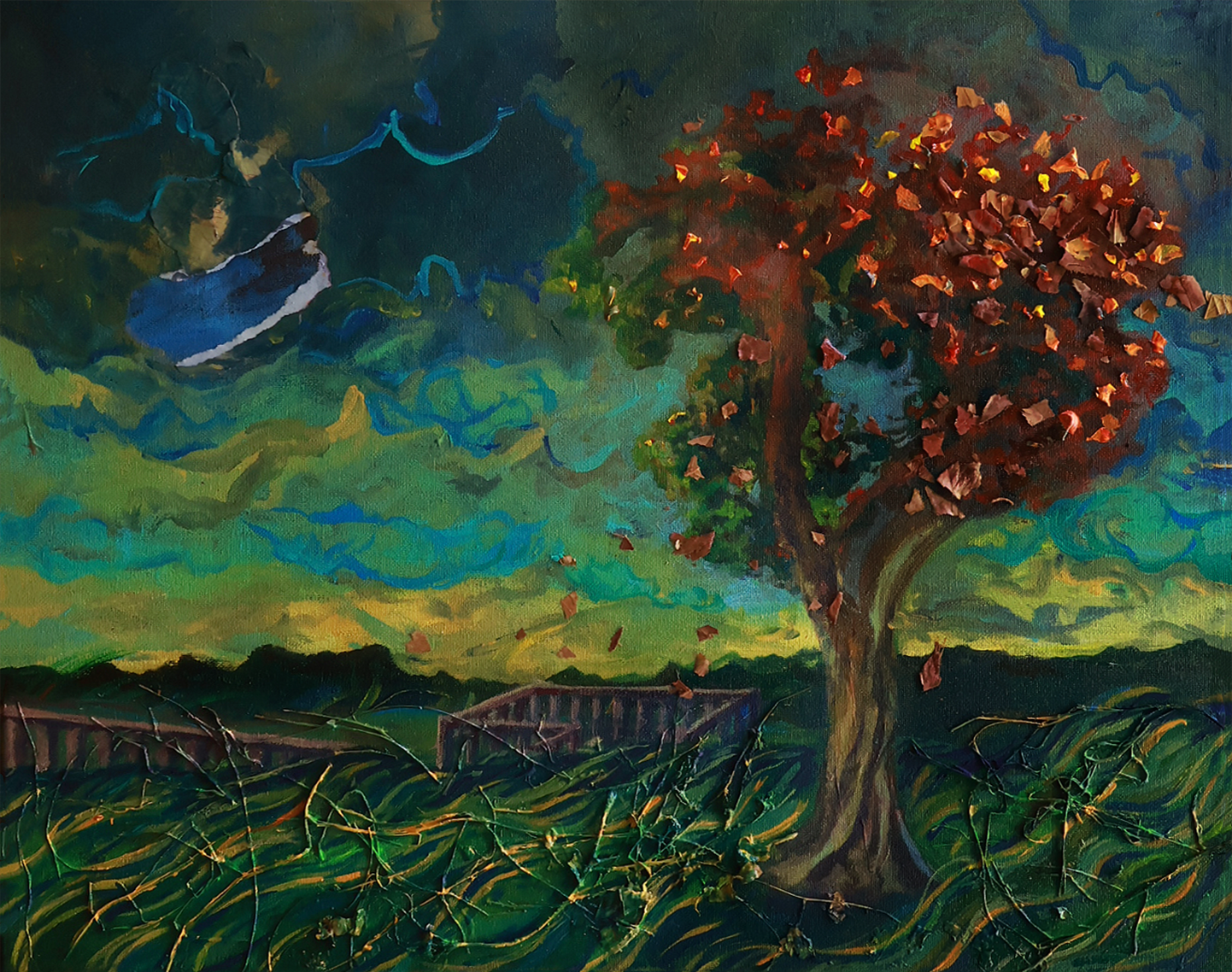 Acrylic, paper, grass, and leaves on canvas 16" x 20"